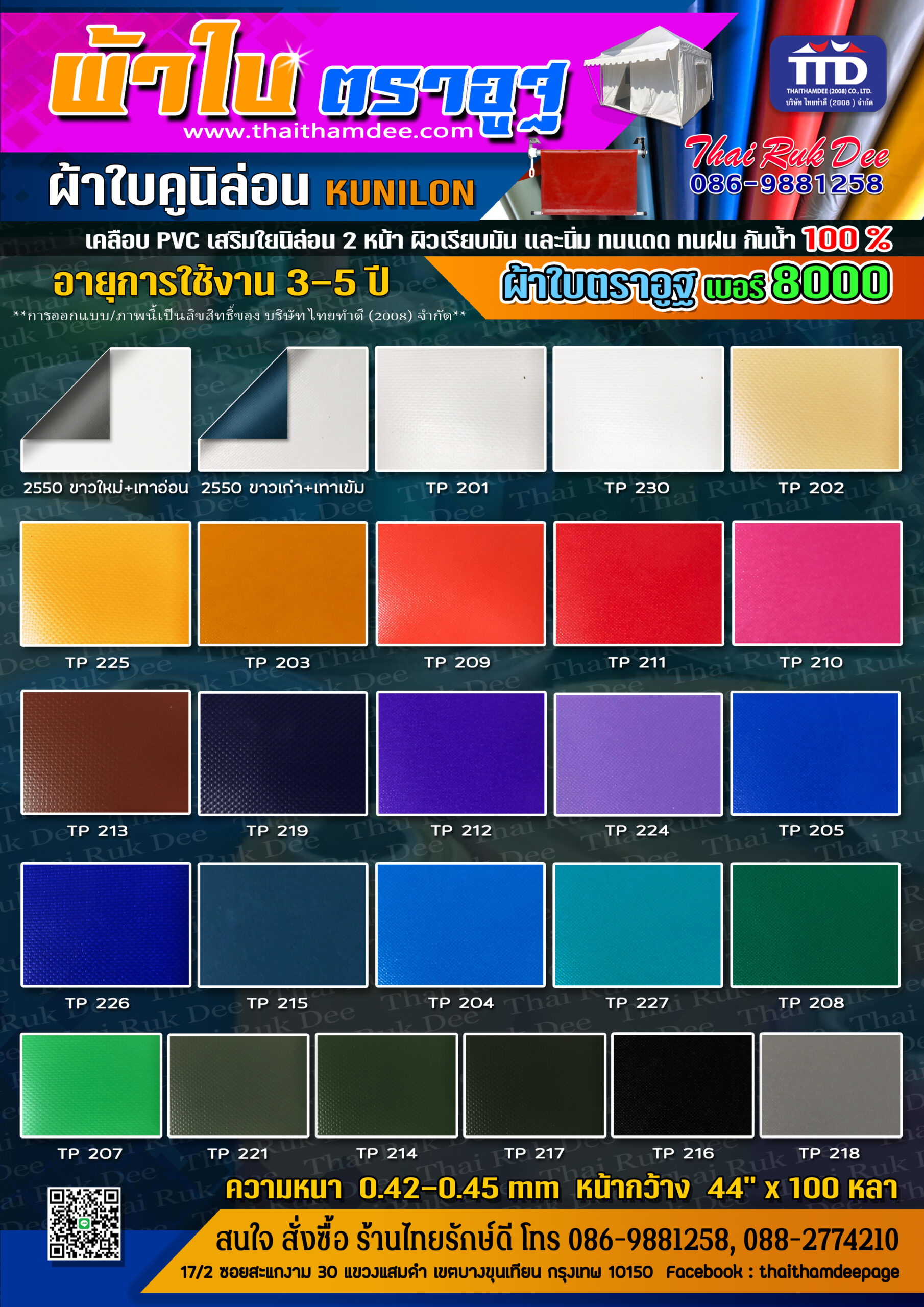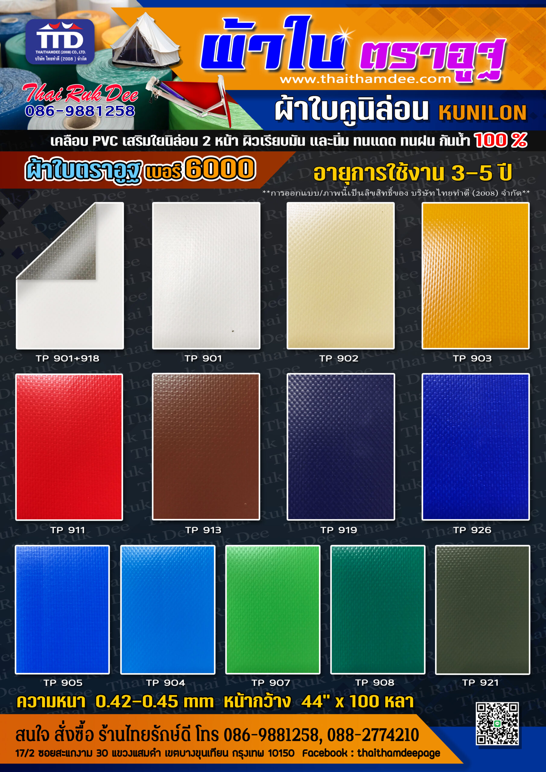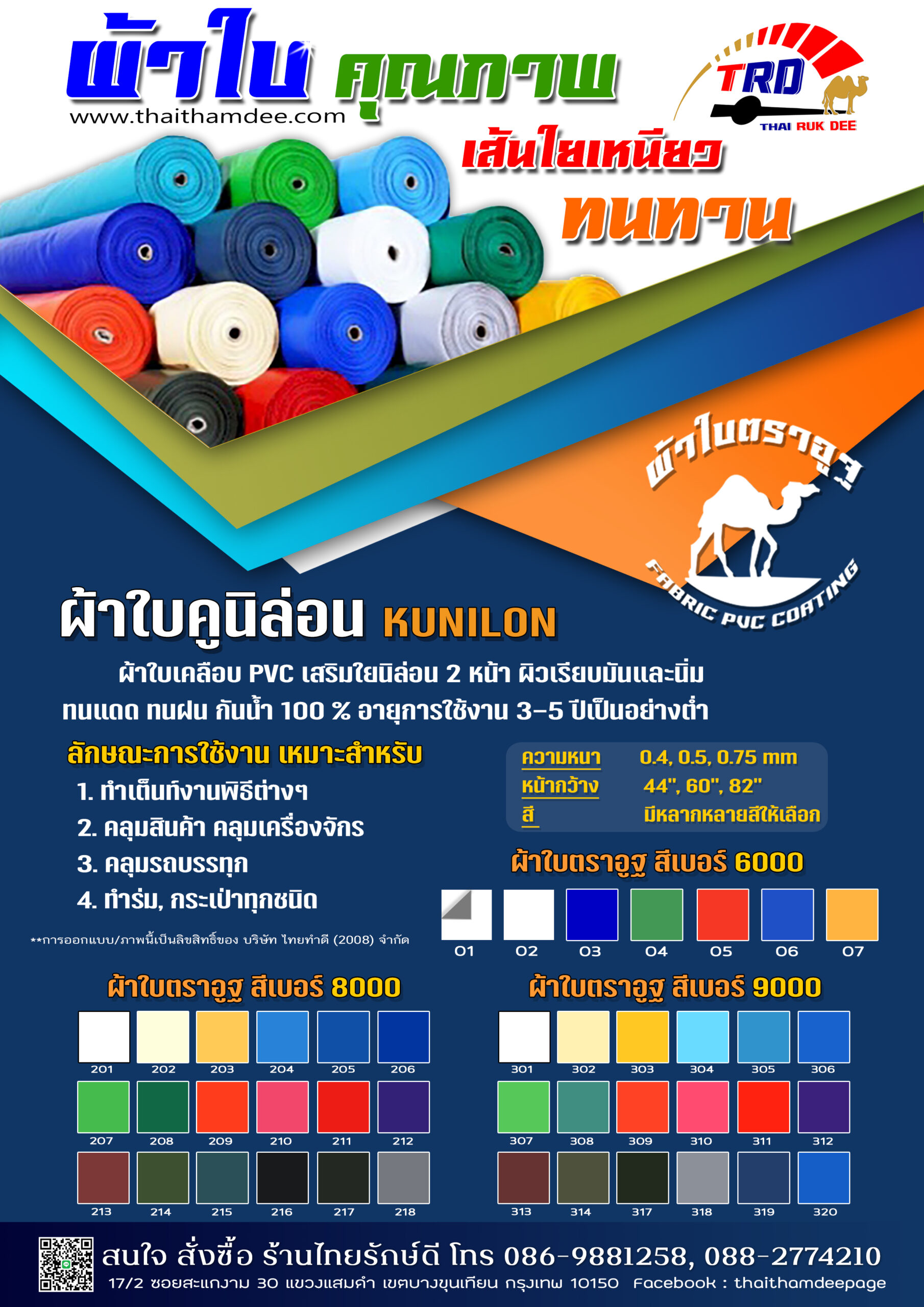 ผ้าใบ / ผ้าหนังเทียม สินค้าไทยทำดี แคตตาล๊อกผ้าใบ / ผ้าหนังเทียม “ไทยทำดี – ผู้ผลิต ผู้จำหน่าย ออกแบบ และติดตั้ง เต็นท์ กันสาดและอุปกรณ์เสริมแบบครบวงจร” ผ้ากระสอบ PE Tarpaulin ผ้ากระสอบ Super PE ผ้ากระสอบ ริ้วลายBlue Sheet ผ้าใบ PELDคลุมสินค้า สำเร็จรูป ผ้าใบ KUNILON ผ้าใบ KUNILON เบอร์ 6000 ผ้าใบ KUNILON เบอร์ 8000 ผ้าใบ KUNILON เบอร์ 9000 ผ้าใบ ตราอูฐ ผ้า Solar ScreenSuntex กรองแสง ผ้าใบทาโพลีน ผ้าหนังเสริมฟองน้ำปั้มลายลอน/ข้าวหลามตัด ผ้าเย็บเสริมฟองน้ำ VIP ผ้าใบถุงลม แอร์แบค ผ้าร่มตราอูฐ 600 D / PVC-01 ผ้า Ripstop PVC ผ้าร่ม ฟินนาเร่ ผ้าใบ SUNSTAR เบอร์ ST00 ผ้าเย็บเสริมฟองน้ำ VIP ลายลูกโลก ผ้าใบกัดแดด สไตล์บาหลี ผ้าร่มตราอูฐ 600 D / PVC-02 ผ้า DYNEEMA ผ้าใบ MEMBRANE ผ้าใบรถบรรทุก คลุมสินค้า เบอร์ 5500 ผ้าหนังเทียม ผ้าใบตาข่ายก่อสร้าง ผ้าร่มตราอูฐ 210 PU ฟินนาเร่ ผ้า TASLON ผ้าร่มตราอูฐ UTD m 3000