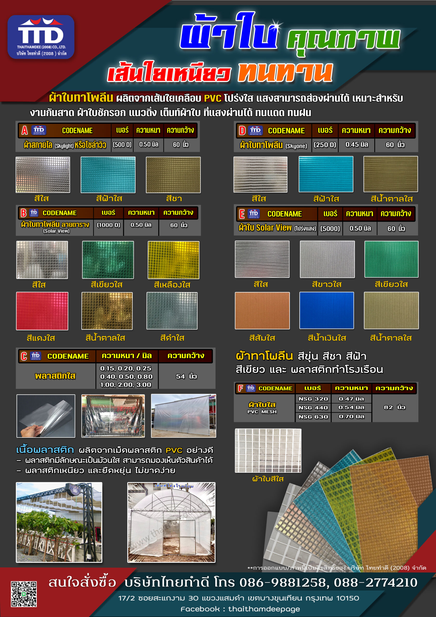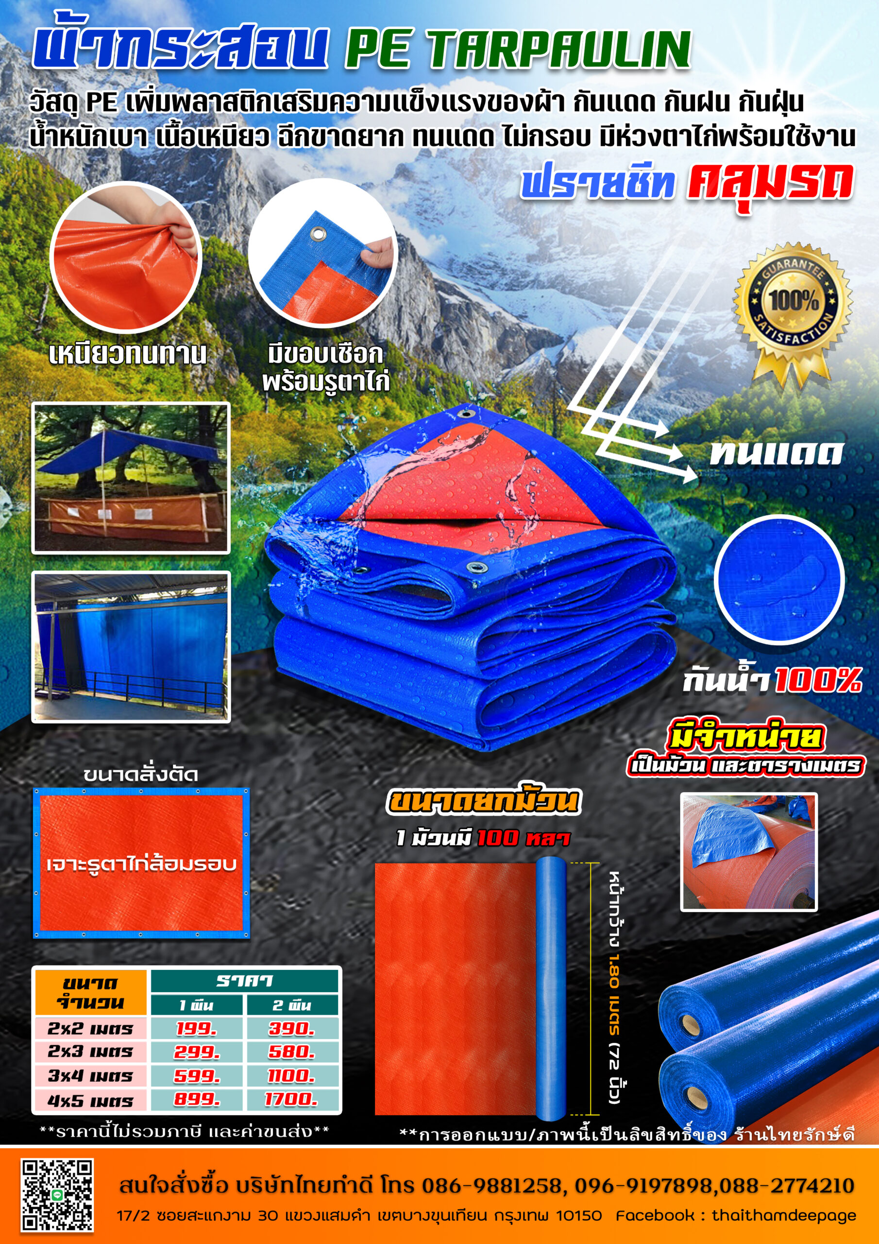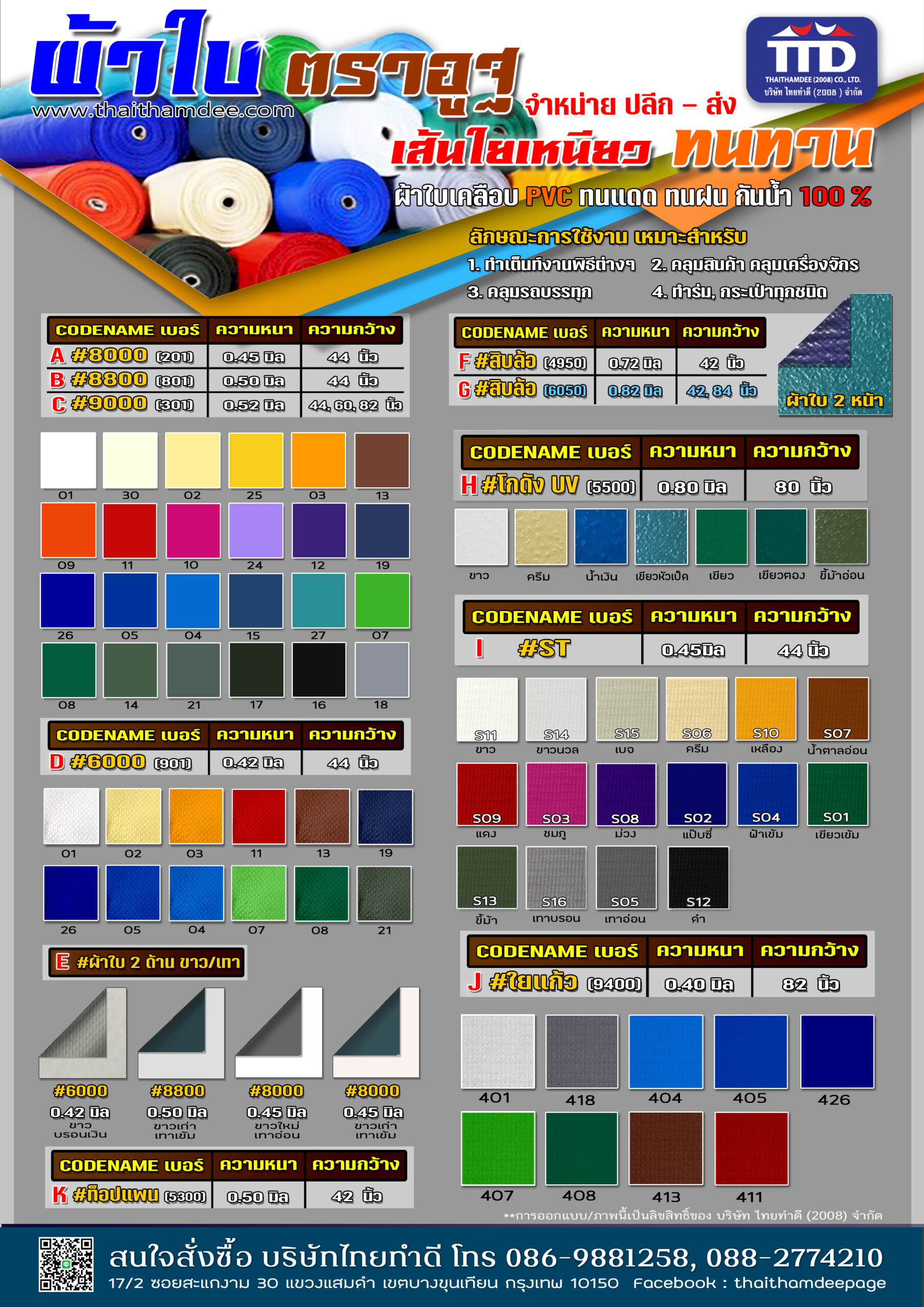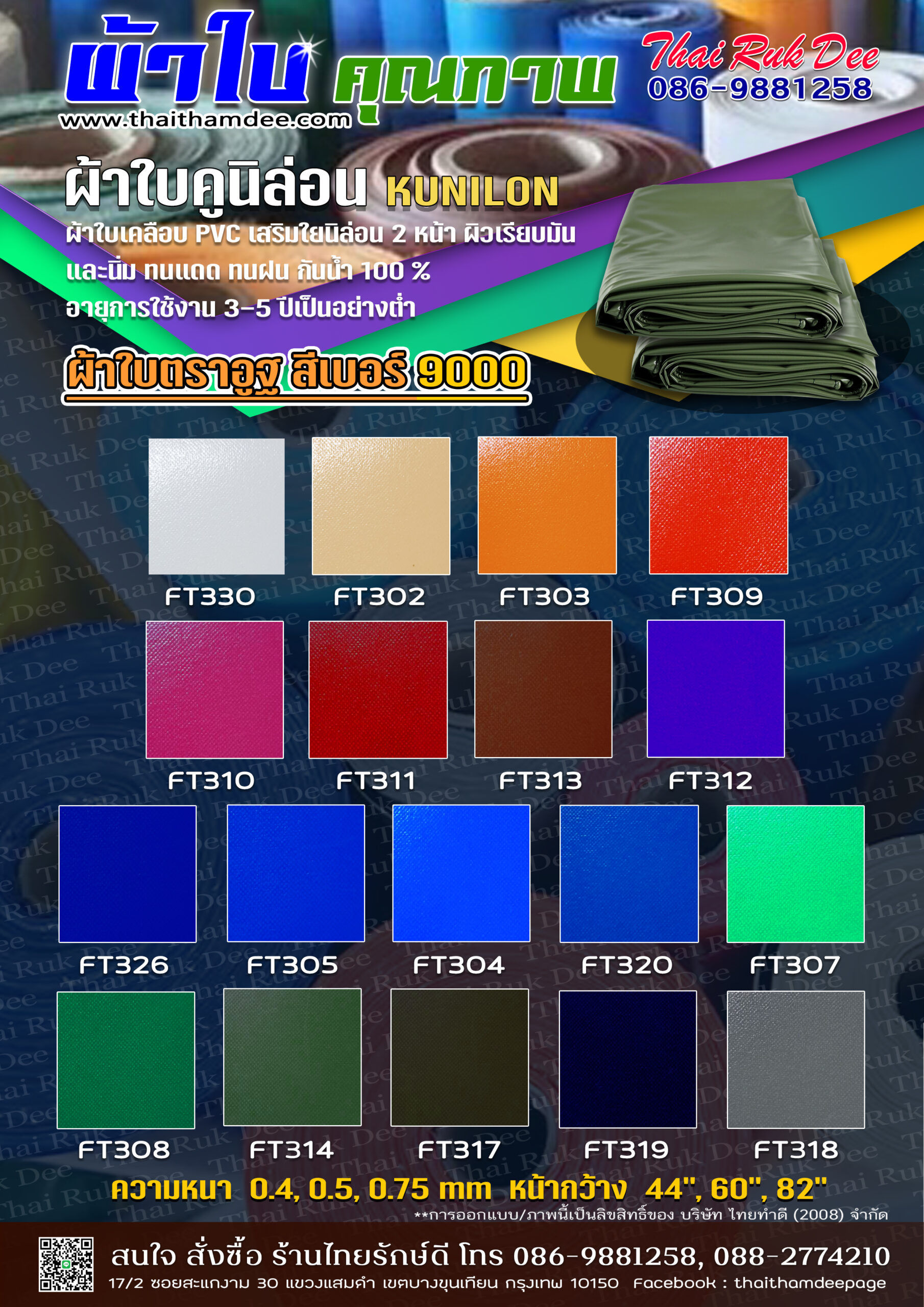ผ้าใบ / ผ้าหนังเทียม สินค้าไทยทำดี แคตตาล๊อกผ้าใบ / ผ้าหนังเทียม “ไทยทำดี – ผู้ผลิต ผู้จำหน่าย ออกแบบ และติดตั้ง เต็นท์ กันสาดและอุปกรณ์เสริมแบบครบวงจร” ผ้ากระสอบ PE Tarpaulin ผ้ากระสอบ Super PE ผ้ากระสอบ ริ้วลายBlue Sheet ผ้าใบ PELDคลุมสินค้า สำเร็จรูป ผ้าใบ KUNILON ผ้าใบ KUNILON เบอร์ 6000 ผ้าใบ KUNILON เบอร์ 8000 ผ้าใบ KUNILON เบอร์ 9000 ผ้าใบ ตราอูฐ ผ้า Solar ScreenSuntex กรองแสง ผ้าใบทาโพลีน ผ้าหนังเสริมฟองน้ำปั้มลายลอน/ข้าวหลามตัด ผ้าเย็บเสริมฟองน้ำ VIP ผ้าใบถุงลม แอร์แบค ผ้าร่มตราอูฐ 600 D / PVC-01 ผ้า Ripstop PVC ผ้าร่ม ฟินนาเร่ ผ้าใบ SUNSTAR เบอร์ ST00 ผ้าเย็บเสริมฟองน้ำ VIP ลายลูกโลก ผ้าใบกัดแดด สไตล์บาหลี ผ้าร่มตราอูฐ 600 D / PVC-02 ผ้า DYNEEMA ผ้าใบ MEMBRANE ผ้าใบรถบรรทุก คลุมสินค้า เบอร์ 5500 ผ้าหนังเทียม ผ้าใบตาข่ายก่อสร้าง ผ้าร่มตราอูฐ 210 PU ฟินนาเร่ ผ้า TASLON ผ้าร่มตราอูฐ UTD m 3000